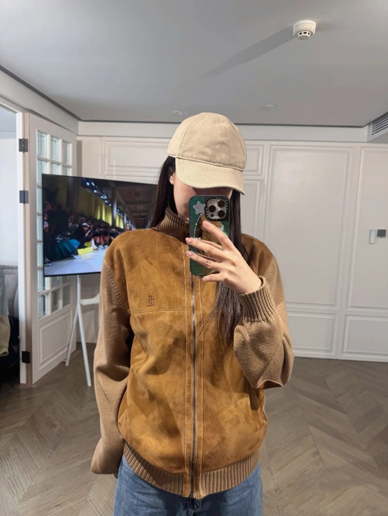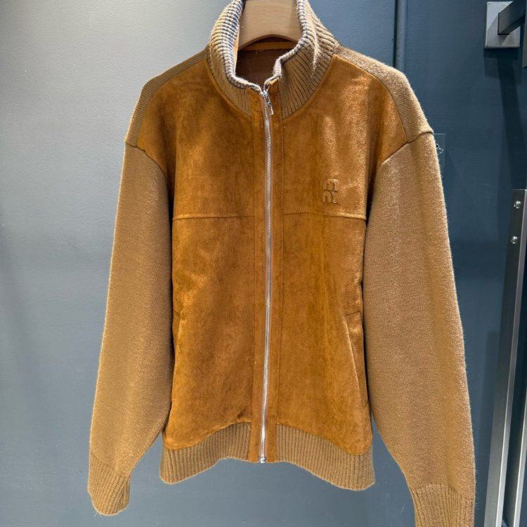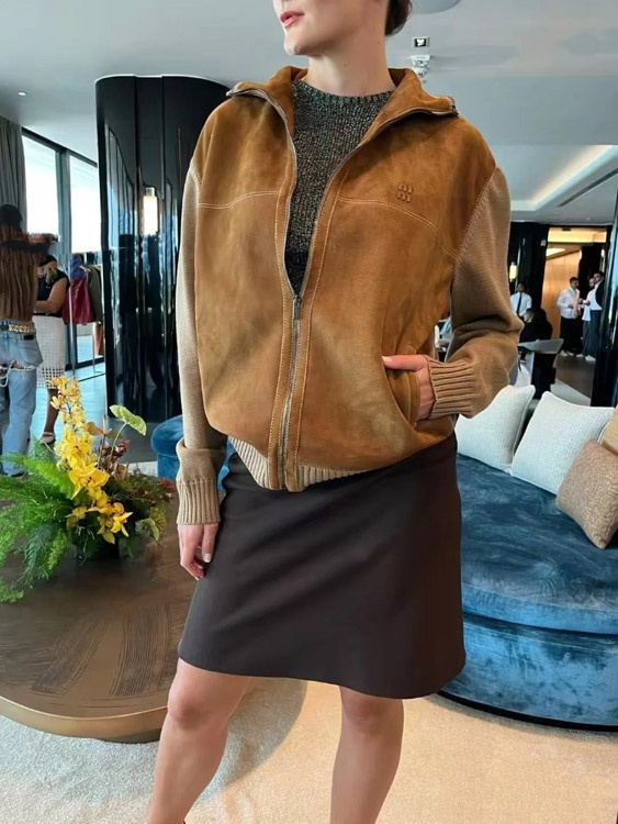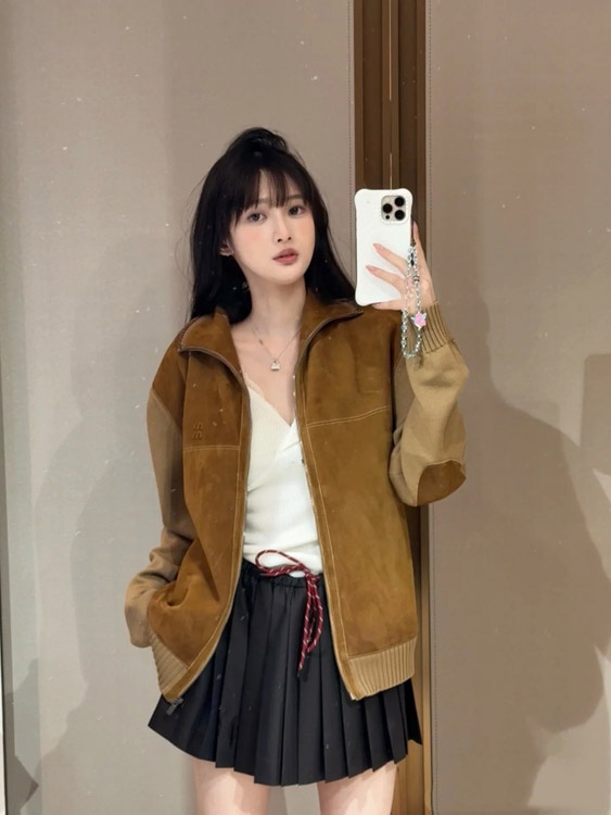Miu Miu new arrival: Knitted sleeve paneling, zip-up, stand-collar casual jacket-5370